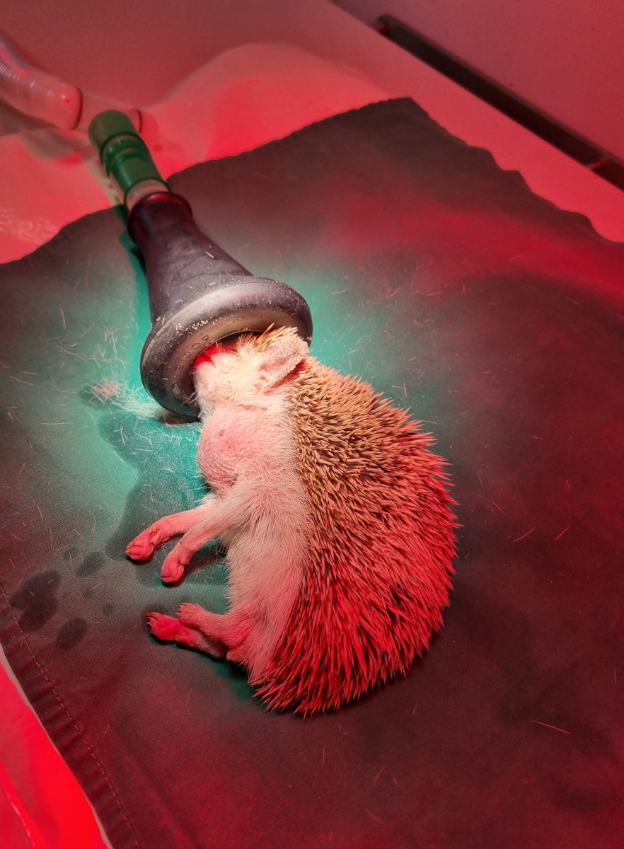 | De egel werd verdoofd met gasanesthesia en het gewzel werd verwijderd. Gelukkig ging dit zeer makkelijk en vlot en kon de egel snel weer vrolijk rondwandelen. Het bleek om een goedaardig lipoom (vettumor) te gaan, we verwachten dat egel Rolypoly zeer vlot zal herstellen en er verder geen last van zal hebben. |