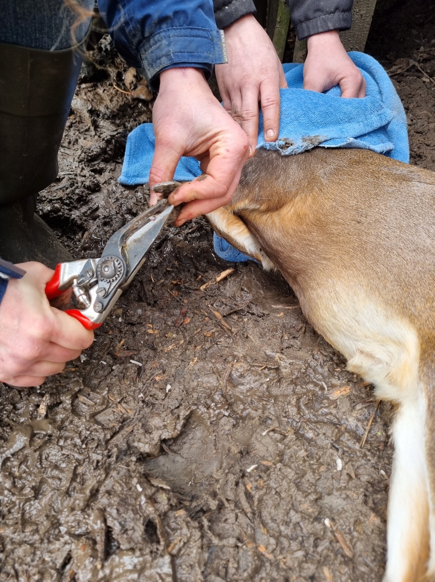 | Muntjak Axus is via een vangsysteem verdoofd en daarna zijn de 'pantoffelklauwen' bijgewerkt. Hij zal verder geen last hebben van deze handeling. |