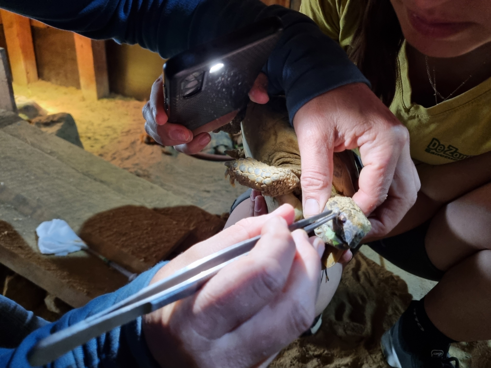 De mond-overgroei van Fietje werd bijgeknipt. Ook werd het vuil bij haar oog schoongemaakt en werd wat weefsel met een pincet weggehaald. De komende 14 dagen krijgt Fietje een zalf voor het oog.