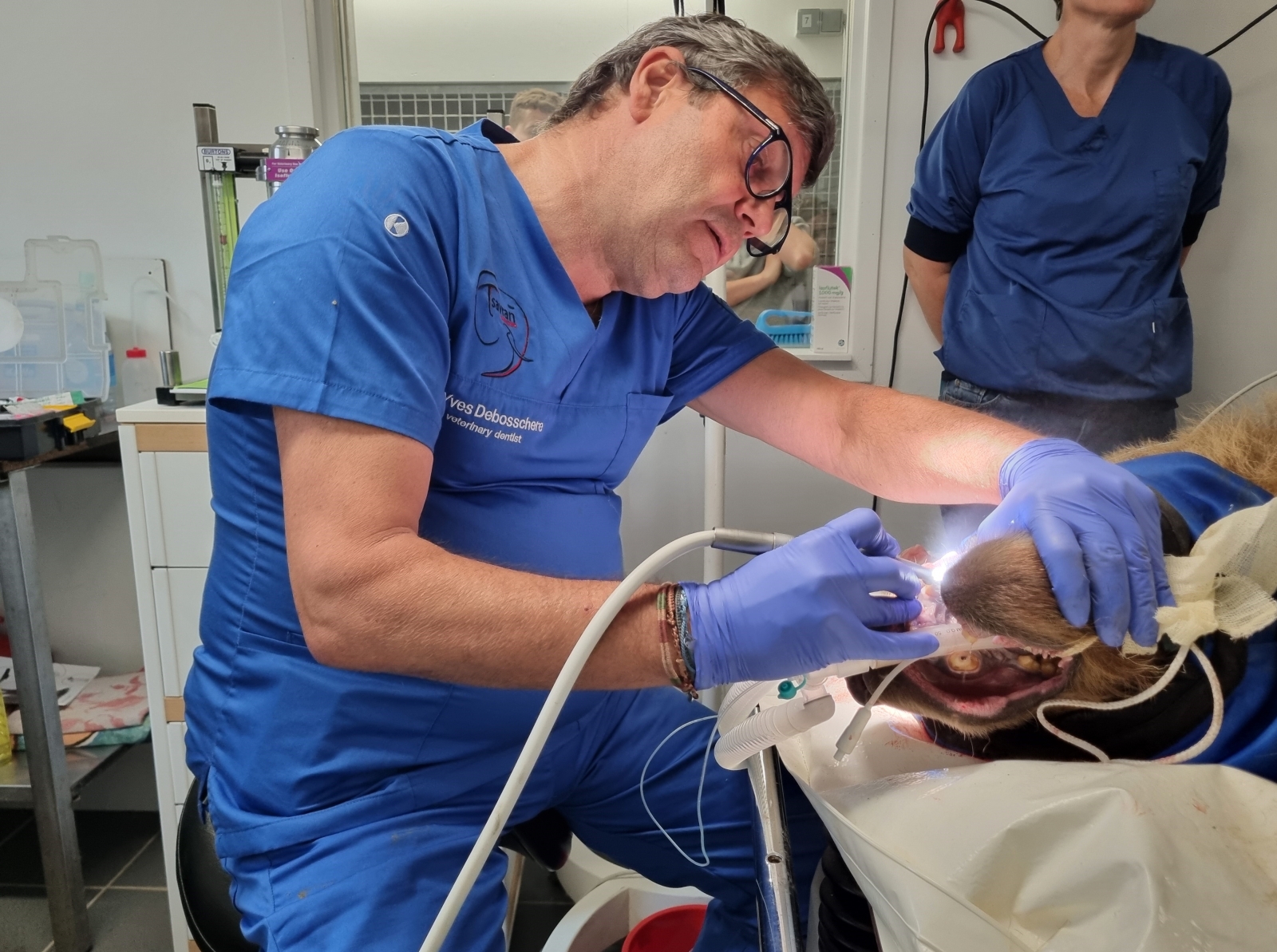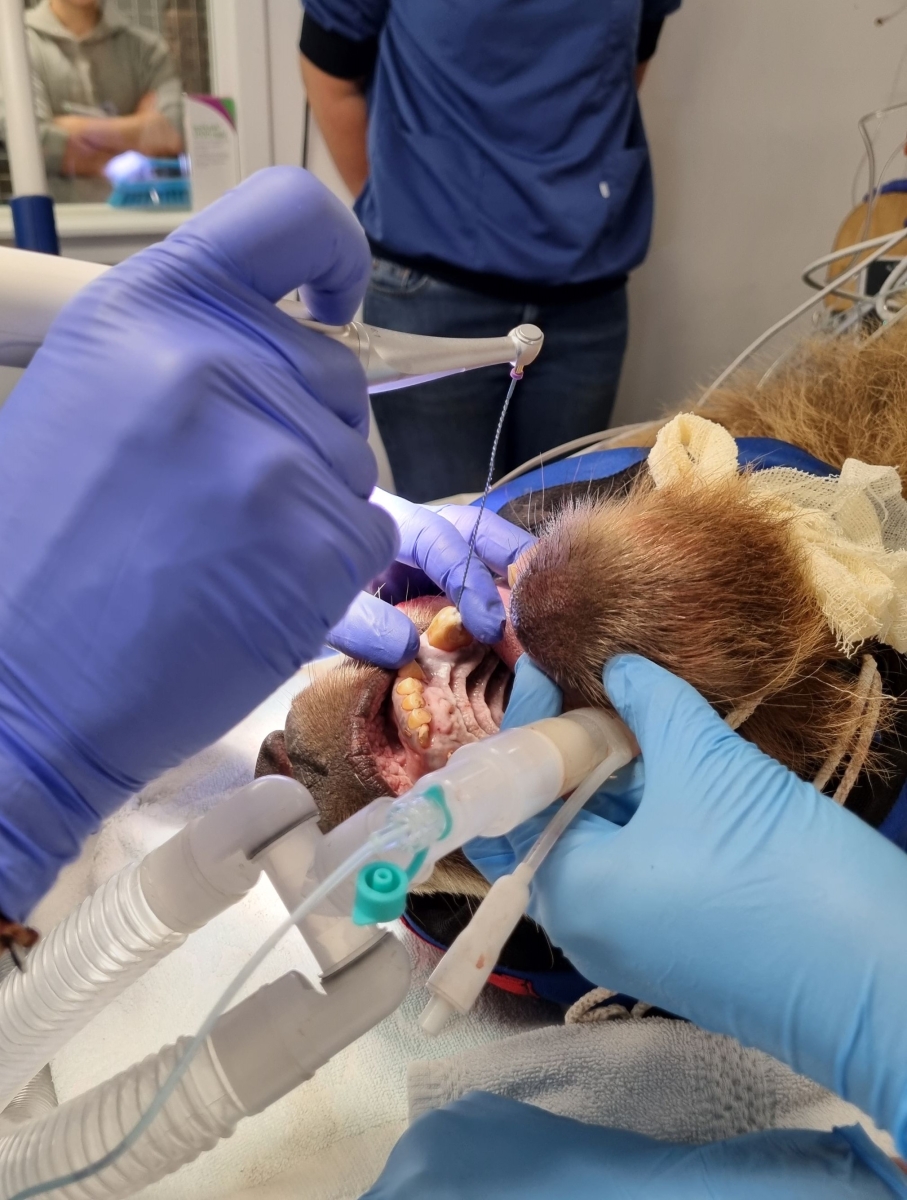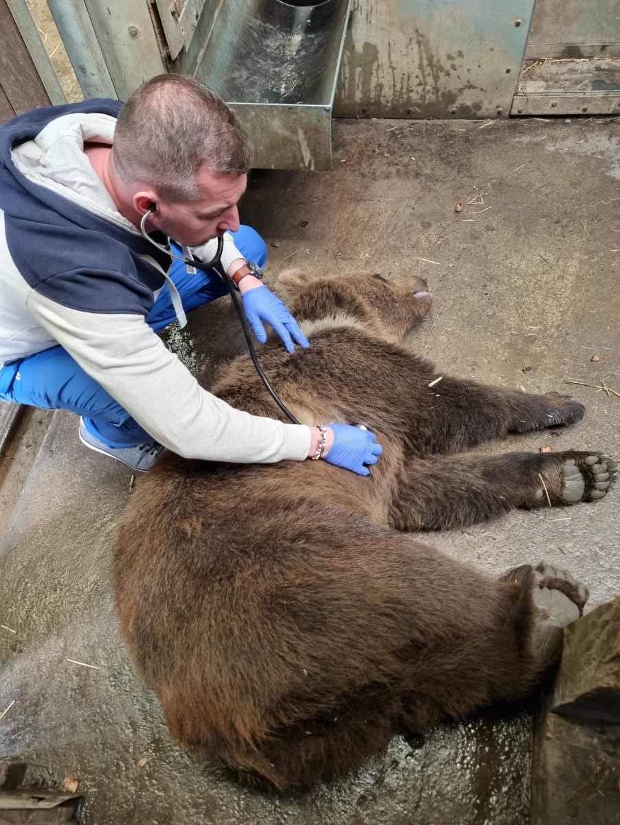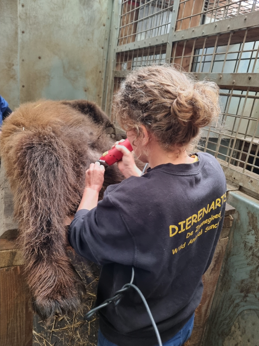 Bruine beer Sandra werd samen met haar broer (Tishka) geëvacueerd uit een plaatselijke zoo in Oekraïne. Dit gebeurde omdat in 2022 de oorlog in Oekraïne uitbrak. Sandra´s vier hoektanden zijn waarschijnlijk afgebroken tijdens het tralies bijten in haar thuisland. Dit kan leiden tot ernstige infecties als het tandmerg bloot komt te liggen. Dit werd vorig jaar al ontdekt, maar de operatie moest uitgesteld worden toen bleek dat ze zwanger was. |